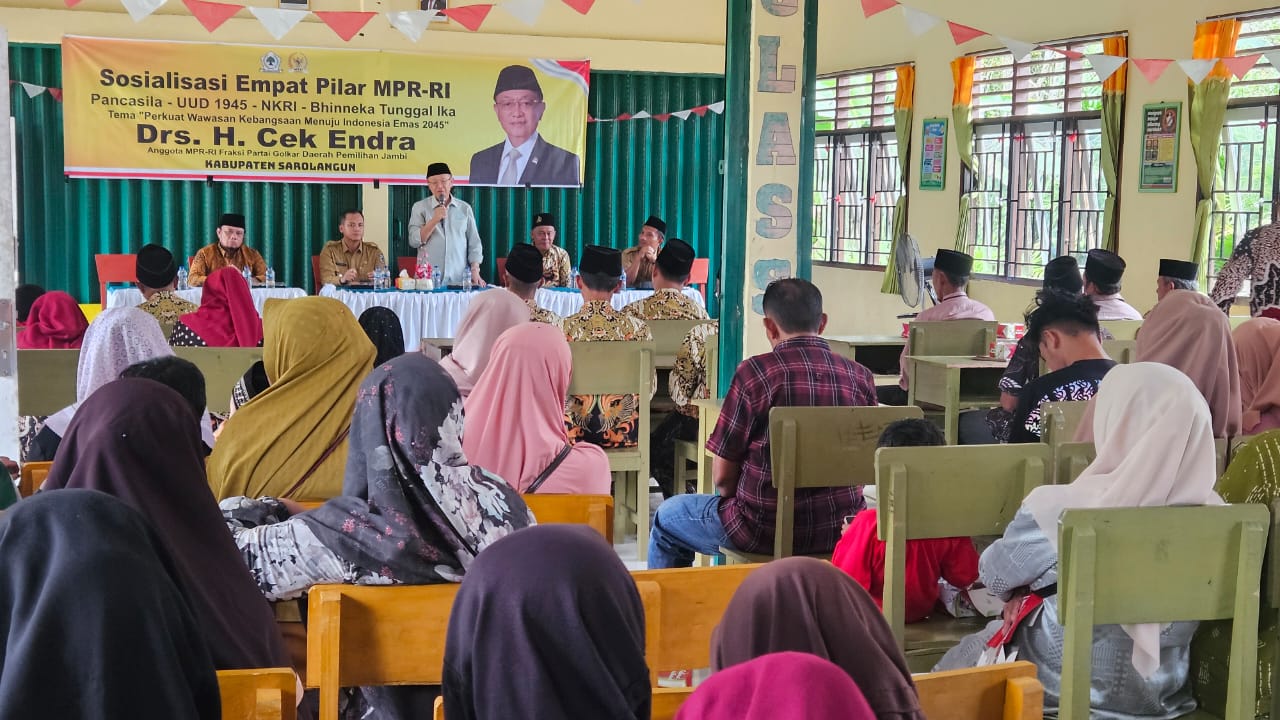 Zonabrita.com – Anggota MPR RI sekaligus Anggota Komisi XII DPR RI dari Fraksi Partai Golkar, Drs. H. Cek Endra, menggelar kegiatan Sosialisasi Empat Pilar Kebangsaan (Pancasila, UUD 1945, NKRI, dan Bhinneka Tunggal Ika) bertempat di Pondok Pesantren Sunan Giri Al-Bajury, Desa Bukit Bumi Raya, Jambi.