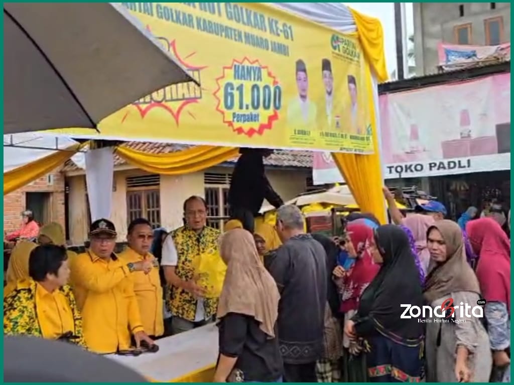Zonabrita.com – Guyuran hujan deras tak sedikit pun memadamkan antusiasme ribuan warga Desa Kedemangan, Kabupaten Muaro Jambi, untuk menghadiri rangkaian peringatan Hari Ulang Tahun (HUT) Ke-61 Partai Golongan Karya (Golkar). Acara Pasar Murah Golkar menjadi magnet utama yang sukses menarik perhatian masyarakat setempat, sekaligus membuktikan komitmen partai di tengah tantangan ekonomi.