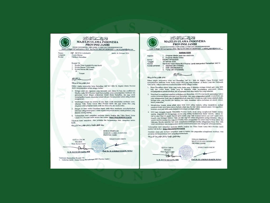 MUI berharap dengan terbitnya seruan ini, suasana Ramadhan 1447 H di Jambi dapat berjalan dengan penuh kekhusyukan, kedamaian, dan menjadi ladang pahala bagi semua pihak yang terlibat dalam menjaga kondusivitas daerah. (Red)