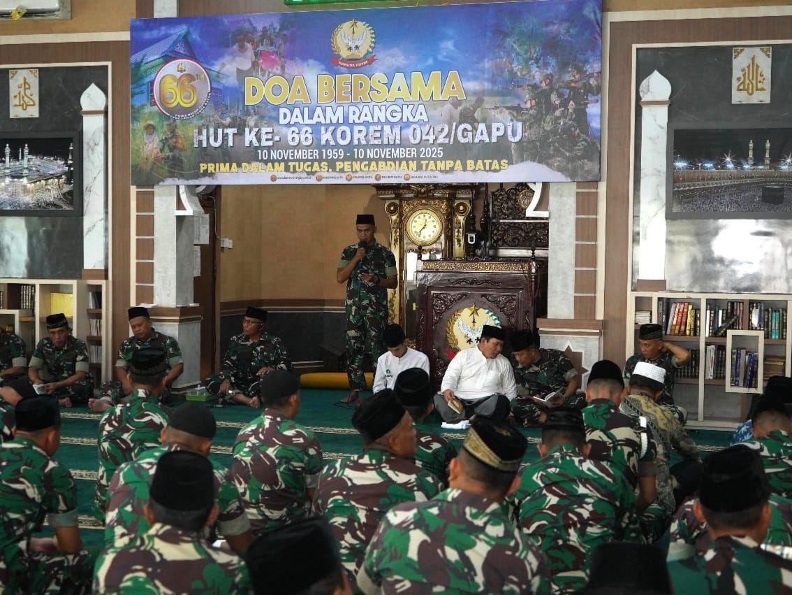 Zonabrita com – Dalam suasana penuh kebersamaan dan rasa syukur, Korem 042/Gapu menggelar acara syukuran Hari Ulang Tahun ke-66, bertempat di Masjid At-Taqwa Makorem 042/Gapu, Jambi. Acara tersebut dipimpin oleh Kasipers Kasrem 042/Gapu Kolonel Arh Agus Setiawan, S.T., mewakili Danrem 042/Gapu Brigjen TNI Heri Purwanto, S.E., M.Sc.